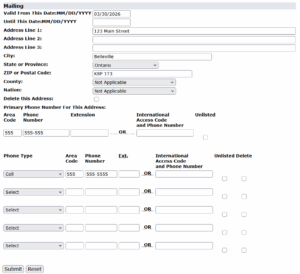 “Mailing” address is used for transcripts, cheques (for refunds), and other official documents that may be sent via post mail. Mailing addresses should always be a valid Canadian address.